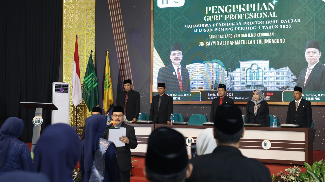 Tulungagung — Universitas Islam Negeri Sayyid Ali Rahmatullah Tulungagung (UIN SATU) menggelar prosesi pengukuhan bagi lulusan Pendidikan Profesi Guru (PPG) Batch 2 dan 3 Tahun 2025 pada Kamis (30/04/2026). Bertempat di kampus setempat, sebanyak 500 peserta hadir secara langsung, sementara ribuan peserta lainnya mengikuti jalannya acara secara daring dari berbagai wilayah, mulai dari Riau hingga Sulawesi.