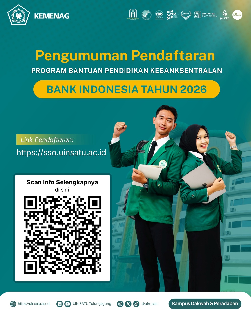 UIN Sayyid Ali Rahmatullah Tulungagung bekerja sama dengan Bank Indonesia membuka kesempatan bagi mahasiswa program S-1 untuk mendapatkan beasiswa Program Bantuan Pendidikan Kebanksentralan Bank Indonesia Tahun 2026.