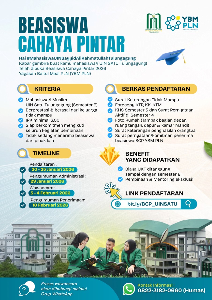 Universitas Islam Negeri Sayyid Ali Rahmatullah Tulungagung bekerja sama dengan Yayasan Baitul Maal PLN (YBM PLN) membuka pendaftaran Beasiswa Cahaya Pintar (BCP) Tahun 2026 bagi mahasiswa UIN SATU Tulungagung. Program beasiswa ini ditujukan untuk mendukung mahasiswa berprestasi dari keluarga kurang mampu melalui pembiayaan UKT serta program pembinaan dan mentoring.