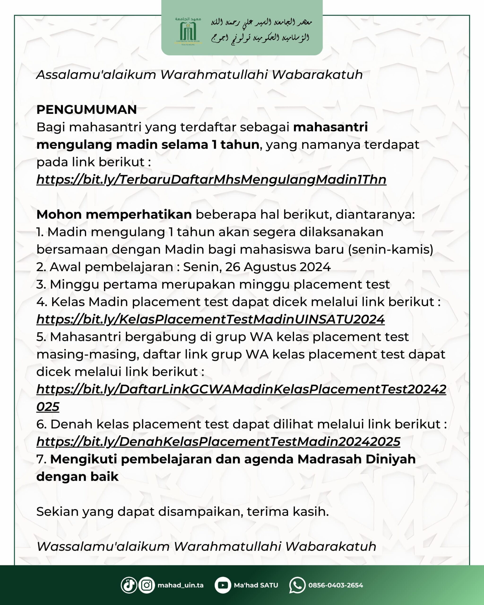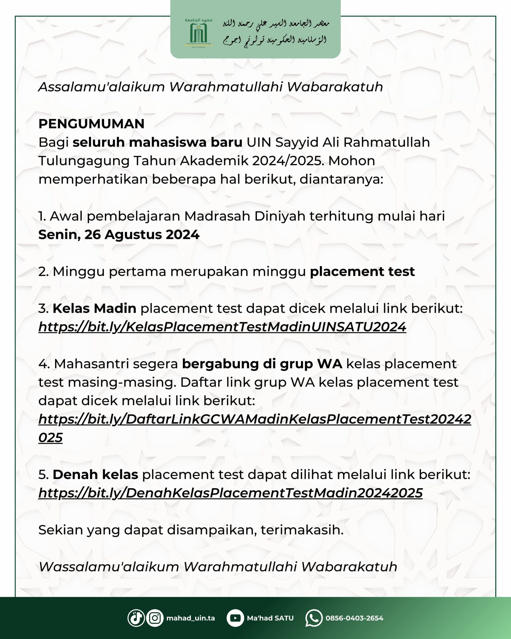 5. Kelas Madin placement test dapat dicek melalui link berikut : https://bit.ly/KelasPlacementTestMadinUINSATU2024 ;